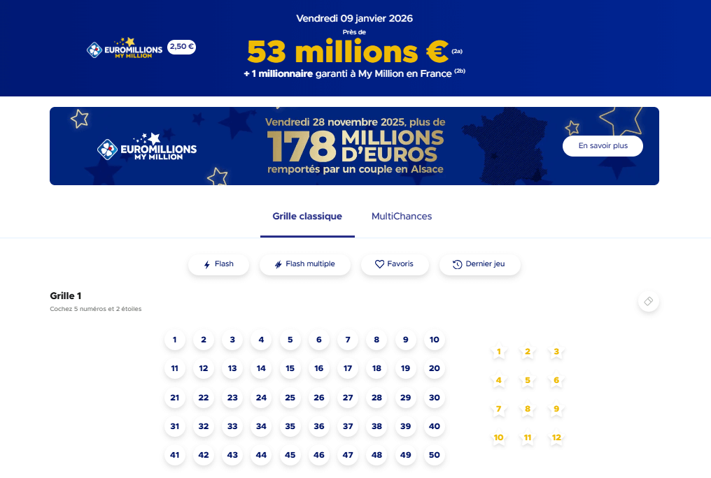 - Prix de la grille : Une mise simple EuroMillions coûte 2,50 €.
