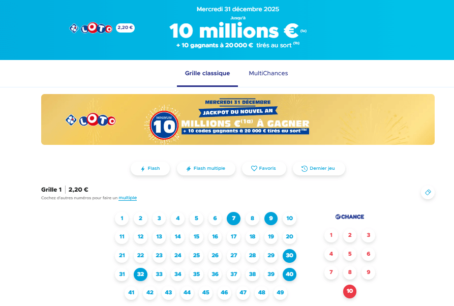 Les règles du jeu sont les mêmes que celles du Loto classique : cochez 5 numéros + 1 Chance et lancez le tirage pour savoir si vous avez gagné. Chaque ticket vous permet de remplir jusqu’à 3 grilles : chacune d’entre elles coûte 1 €.